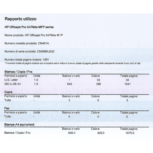 Stampante Inkjet Colori HP OfficeJet Pro X476dw 36ppm 1200dpi USB WiFi USATA, funzionante, testata, solo problema nell'emissione del nero (come da immagine allegata), per questo motivo viene venduta per pezzi di ricambio